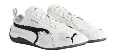 プーマ(PUMA)のアイコンモデル「スピードキャット(Speedcat)」をベースに、バレンシアガ(BALENCIAGA)が大胆な再解釈を加えた3型のスニーカーだ。もともと耐火レーシングシューズを起源とする「スピードキャット」は、低重心でシャープなフォルムが特徴であり、そのスポーティーな伝統にモードな感性を重ねることで新たな表情が生まれている。
